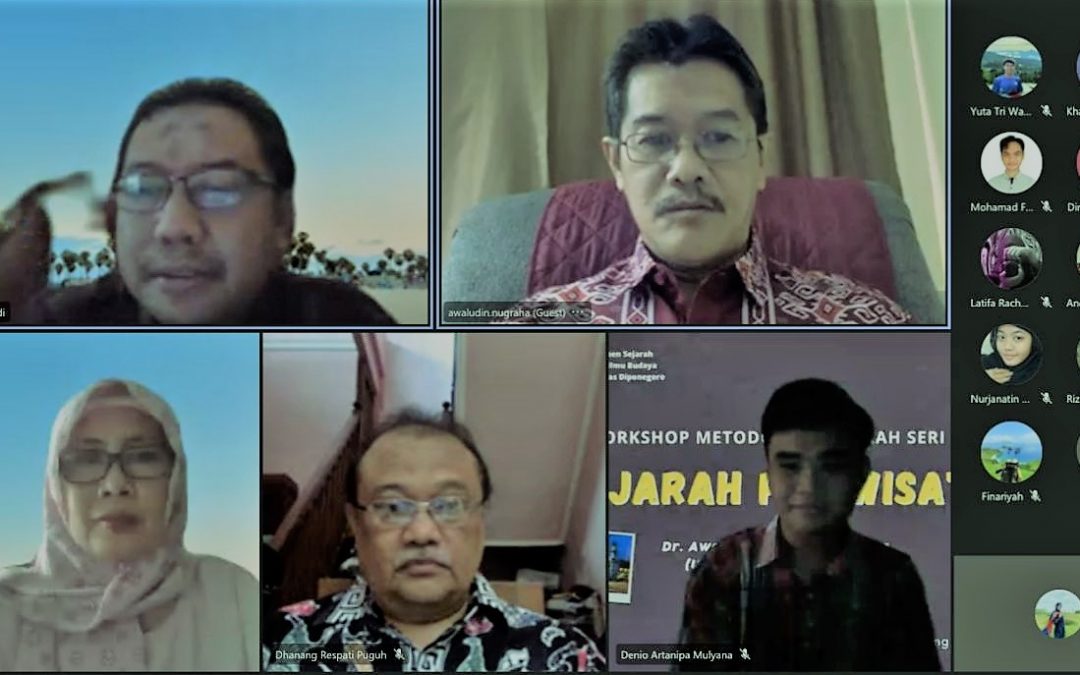 Dr. Awaludin Nugraha, M.Hum. dari Program Studi Sejarah Universitas Padjajaran diundang secara khusus sebagai pembicara karena kepakaran beliau linier dengan tema besar workshop ini. Dimoderatori oleh Dr. Haryono Rinardi, M. Hum., workshop ini berjalan begitu dinamis dengan mengungkap berbagai hal penting di antaranya terkait makna dasar dari sejarah pariwisata, konsep dan teori yang bisa dipakai sebagai pisau analisis atau guideline, dan peluang-peluang tema yang menarik untuk ditinjaklanjuti sebagai sebuah riset yang sungguh-sungguh.