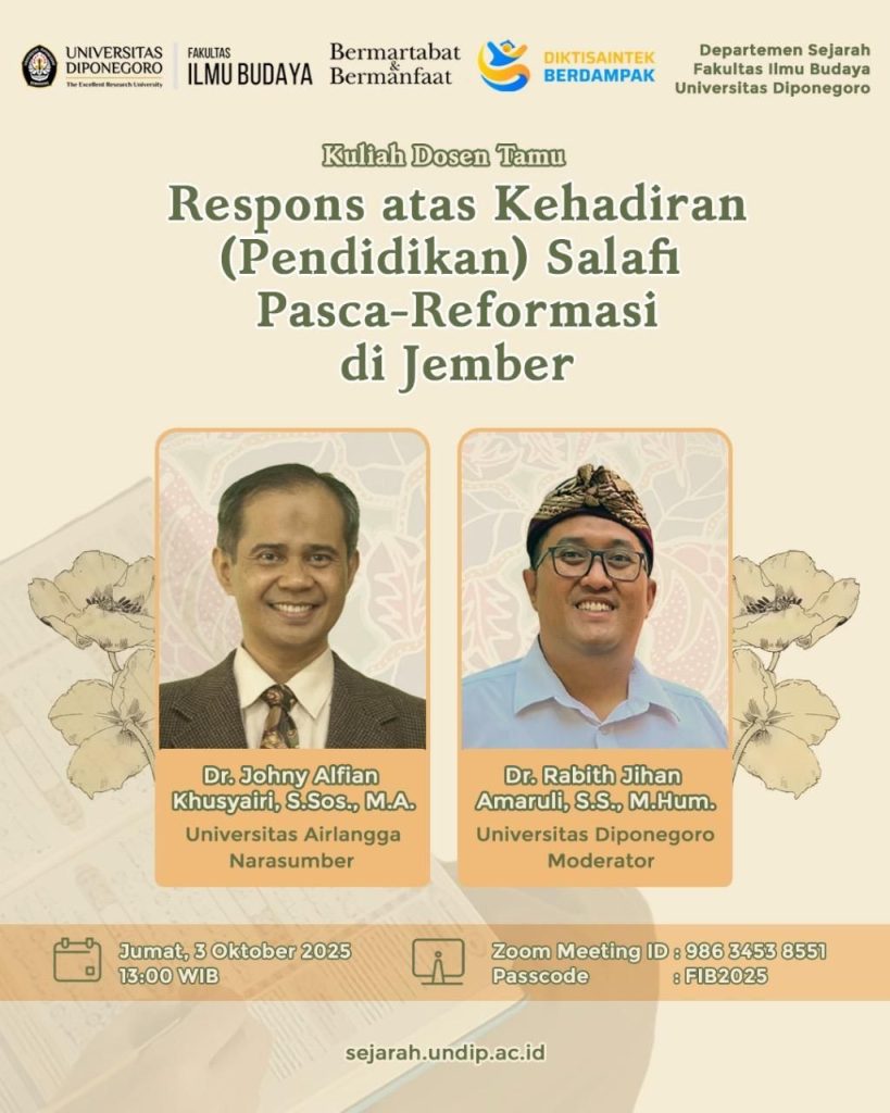 Pada 3 Oktober 2025, Departemen Sejarah Fakultas Ilmu Budaya Universitas Diponegoro mengadakan Kuliah Dosen Tamu secara daring melalui platform Zoom. Acara yang berlangsung dari pukul 13.00 hingga 15.30 WIB ini mengangkat tema “Respon atas Kehadiran (Pendidikan) Salafi Pasca-Reformasi di Jember”. Prof. Dr. Alamsyah, M.Hum., selaku Dekan Fakultas Ilmu Budaya, membuka acara tersebut. Kuliah ini bertujuan […]