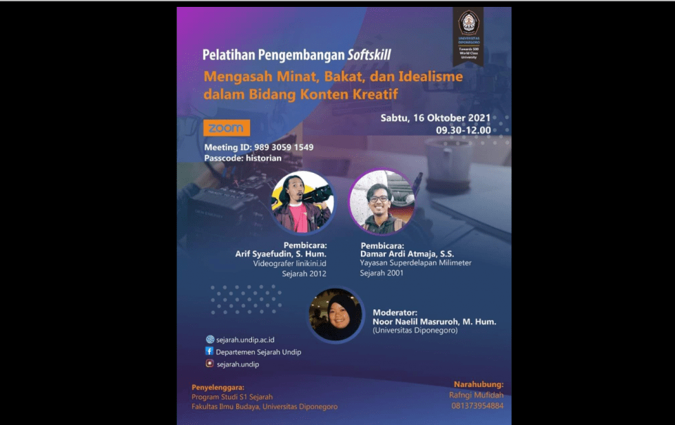 Departemen Sejarah Fakultas Ilmu Budaya Universitas Diponegoro, menyelenggarakan pelatihan pengembangan softskilldengan topik, “Mengasah Minat, Bakat, dan Idealisme dalam Bidang Konten Kreatif”, pada 16 oktober 2021 via Zoom. Dalam sambutannya, Dr. Dhanang Respati, M. Hum., selaku Ketua Departemen Sejarah menyampaikan bahwa acara ini diinisiasi sebagai upaya Program Studi Sejarah untuk meningkatkan kompetensi dan keterampilan mahasiswa dalam bidang […]