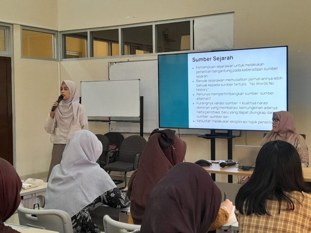 The first presentation was delivered by history lecturer Dr. Tri Handayani, M.Si., with the topic “Tips for Generating Ideas and Developing Ideas in Historical Research and Writing.” Dr. Tri Handayani explained that various inspirations for research ideas can actually be found by students in their surroundings, such as their environment, by exploring available literature, and by trying out new atmospheres for writing when facing writer’s block.