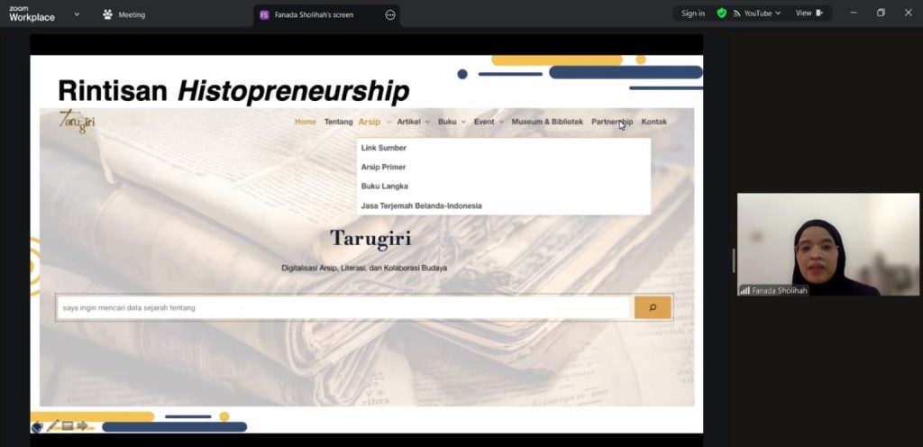“ Semarang, October 17, 2025 – The History Department of the Faculty of Cultural Sciences, Diponegoro University (FIB UNDIP) successfully held an entrepreneurship training entitled “Building the Spirit of Histopreneurship among History Students.” The event was held online via the Zoom digital platform. The event was opened by the Secretary of the History Study Program at FIB UNDIP, Dr. Rabith Jihan Amaruli, M.Hum. In his speech, he said that the spirit of entrepreneurship is important for students in the current era and that history can be used as capital for entrepreneurship. The keynote speaker was Fanada Sholihah, M.Hum., founder and manager of tarugiri.org, a digital platform active in the fields of historical archives, articles, and books. The event was moderated by Bahagio Raharjo, M.A.”